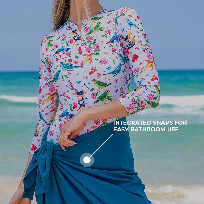 From hidden zippers to buttons that keep your swimsuit from flying up, Esther Rouimi is comfortably modest.